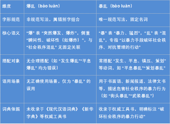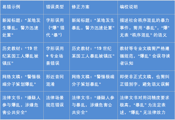 3.“爆乱”与“暴乱”编校实用手册发表时间:2025-10-29 14:55 核心总纲规范汉语中,“暴乱” 是唯一表 “破坏社会秩序的暴力行动” 的正确写法,“爆乱” 为字形误用(“爆” 侧重 “爆炸、突然爆发”,与 “有组织 / 持续性的暴力混乱” 语义不符)。编校核心:凡描述 “群体或个人以暴力破坏社会秩序、危害公共安全” 的行为,统一用 “暴乱”;遇 “爆乱” 直接判定为错误并修正,无例外场景。 一、基础辨析:“爆乱” 与 “暴乱” 核心差异![]() 二、高频易错场景与修正方案![]() 三、编校判定规则(直接套用)1.语义判定法:若语境含“暴力破坏社会秩序、危害公共安全”,必用 “暴乱”,“爆乱” 全为错误(如 “处理暴乱事件” 正确,“处理爆乱事件” 错误)。 2.字形溯源法:“暴” 从 “日”(本义与 “显露、猛烈” 相关),“乱” 从 “乙”(本义与 “混乱” 相关),二者语义契合;“爆” 从 “火”(本义与 “火焰、爆炸” 相关),与 “乱” 搭配无逻辑关联。 3.搭配验证法:凡能与“平息、镇压、策划、发生” 搭配的 “bào luàn”,必为 “暴乱”;“爆乱” 无法与这些动词合理搭配(如 “平息爆乱” 读不通,“平息暴乱” 语义通顺)。 4.场景排除法:无任何场景(新闻、法律、历史、日常)中“爆乱” 为规范用法,即使作者主张 “习惯写法”,也需强制修正为 “暴乱”。 四、不同文稿类型的编校重点1. 法律、政治、官方文件(如:政府公文、法律法规、白皮书、官方声明、新闻报道)编校重点:绝对准确与政治正确必须使用“暴乱”。这是原则性问题,不容有任何差错。使用“爆乱”会被视为严重的政治错误或专业性缺失。强调定性:这类文稿使用“暴乱”一词,本身就是对事件性质的严肃定性,带有明确的法律和政治评判色彩。编辑必须深刻理解其分量。检查上下文:确保与“暴乱”搭配的词语是恰当的,如“平息暴乱”、“暴乱分子”、“策划暴乱”等,这些固定搭配能强化事件的严重性和非法性。零容忍:对此类错误的容忍度为零。2. 新闻媒体报道(如:通讯稿、社论、深度报道)编校重点:专业、准确、符合规范严格使用“暴乱”。遵循国家通用语言文字规范和新闻出版行业标准。注意使用层级:在新闻报道中,对于事件的描述有一个用词严密度阶梯。例如:“聚集 -> 示威 -> 骚乱 -> 暴乱”。编辑需要根据官方通报和事实依据,判断是否达到了“暴乱”的级别,不能随意升级或降级。防范输入法错误:这是最常见的错误来源。由于拼音输入法“baoluan”的首选词可能是“爆乱”,编辑和记者极易打错。编校时必须作为重点盯防对象,利用软件查找和人工复核双重保险。3. 学术著作与论文(如:历史、政治学、社会学论文)编校重点:概念严谨与引述忠实正文论述部分:必须使用标准的“暴乱”。学术著作要求概念的精确性,使用错误词汇会影响论述的严谨性和可信度。引文部分:如果引用的古籍或早期文献中确实出现了“爆乱”字样,应保留原貌,并加引号注明,必要时可以加注释说明:“原文如此,今通用‘暴乱’”。这体现了对史料的尊重和学术的严谨。4. 文学创作(如:小说、剧本、诗歌)编校重点:语境与表达效果通常应使用“暴乱”。以符合现代汉语规范。特殊艺术处理:在极少数情况下,作者可能为了特定效果(如塑造一个文化水平不高的角色,或营造一种古语氛围)而刻意使用“爆乱”。在这种情况下,编辑应尊重作者的创作意图,但最好能与作者沟通确认,确保这是有意为之的艺术选择,而非无心之失。5. 网络与新媒体内容(如:公众号文章、微博、论坛帖子)编校重点:基础规范与风险规避纠正为“暴乱”。虽然网络用语相对宽松,但作为负责任的发布者,应使用规范用语。规避敏感词风险:在内容审核中,“暴乱”是一个高度敏感的词汇。错误地使用“爆乱”可能导致机器审核误判或漏判,也可能引发读者对内容专业性的质疑。正确使用规范词,本身就是一种风险管理和品牌形象维护五、编校工具辅助使用1. 黑马校对(适用于出版、新闻等专业领域)•操作流程: ① 将文稿导入黑马校对软件,选择 “全文校对” 模式; ② 软件会自动标记 “爆乱” 为 “形近字错误”,并在右侧 “错误说明” 中标注 “‘爆乱’应为‘暴乱’,‘暴’表暴力混乱,‘爆’表爆炸”; ③ 点击 “自动修正” 或 “手动替换”,完成修改后生成 “校对报告”,记录错误位置与修正结果。 •核心优势:不仅识别错误,还提供语义解析,辅助编辑向作者解释修正依据; •适用场景:图书、期刊、新闻稿等对用词规范要求极高的文稿。 2. Grammarly(适用于中英文混排文稿)•操作流程: ① 在 Grammarly 中上传中文文稿,开启 “中文校对” 功能; ② 软件会将 “爆乱” 标记为 “用词错误”,建议修改为 “暴乱”,并补充 “‘暴乱’是描述社会暴力事件的标准术语”; ③ 若文稿含英文 “riot”(对应中文 “暴乱”),软件会联动提醒 “避免将‘riot’译为‘爆乱’,正确译法为‘暴乱’”。 •核心优势:适合中英文对照文稿(如国际新闻、涉外报告),避免双语翻译中的用词偏差。 六、记忆口诀与避坑要点(一)记忆口诀“暴力混乱用暴乱,‘暴’表激烈记心间; ‘爆’从火旁指爆炸,错写‘爆乱’必修正。” (二)避坑要点1.避免“形近音同混淆”:记住 “‘暴乱’的‘暴’无火字旁,与暴力相关;‘爆炸’的‘爆’有火